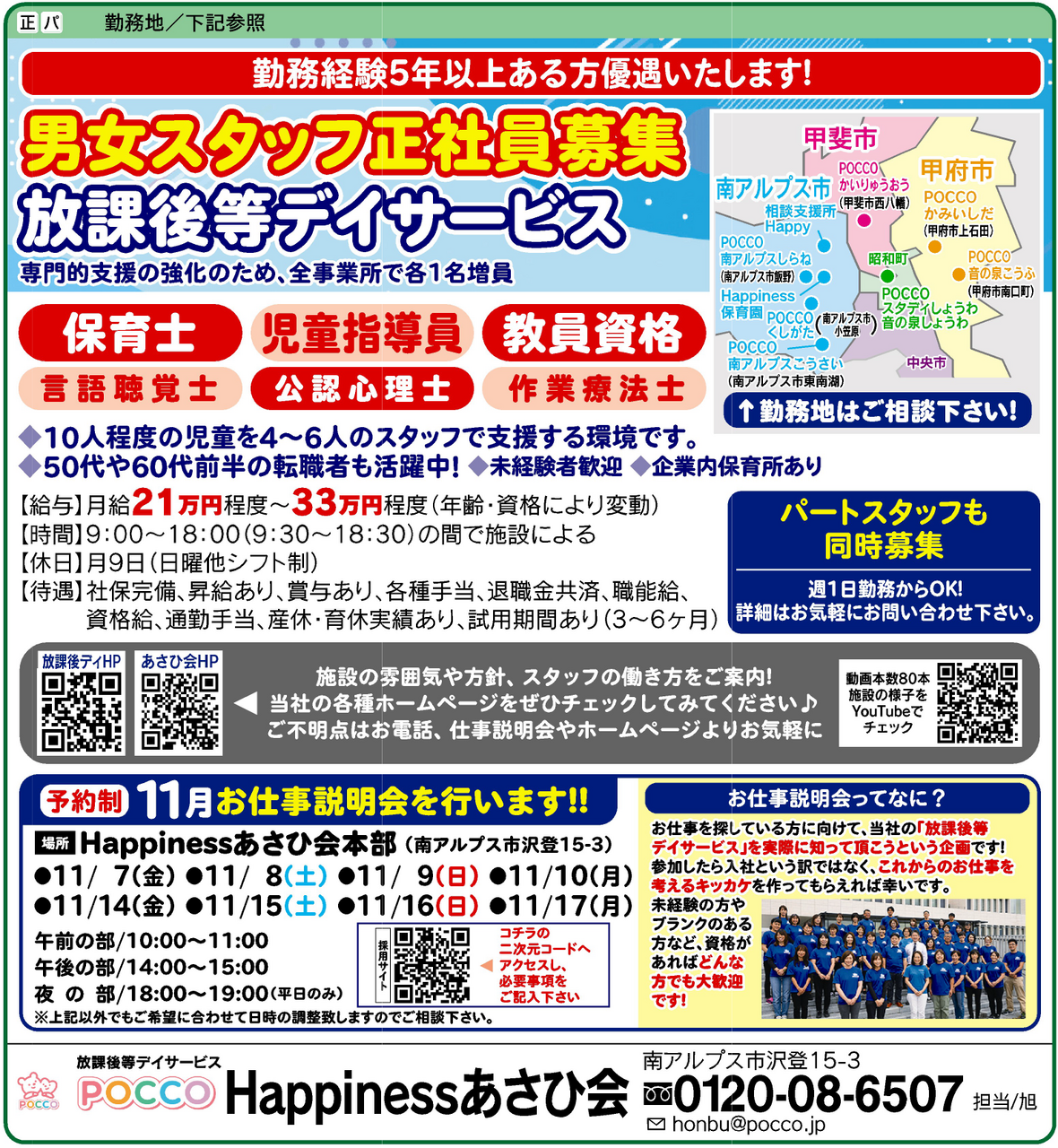 11/7-10・11/14-17開催・予約制◇保育士・教員資格者等大募集◇放課後等デイサービス